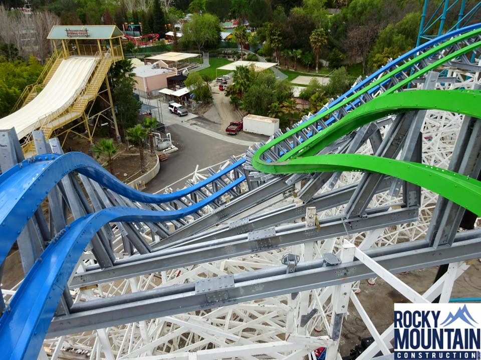 Racing coasters are lots of fun. But what happens when you throw in Rocky Mountain Construction? You get insanity. Their Twisted take on the classic Colossus coaster at Magic Mountain (you may remember it from the classic movie National Lampoon’s Vacation) is nothing short of magic. You’ll twist, turn, flip, and nearly get ejected from your seat as you race along. Even better, you actually get to race on both sides each ride. You’ll first go on the blue track, then come back around and switch over to the green track to do it again.
