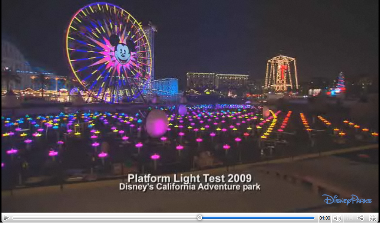 The Disney Parks Blog has posted numerous videos that have some great footage of the testing for World of Color. Above we can see most all of the fountain nozzle LED’s going through a rainbow pattern. The beautiful image above gives you a very vivid idea of just how large the platform is.