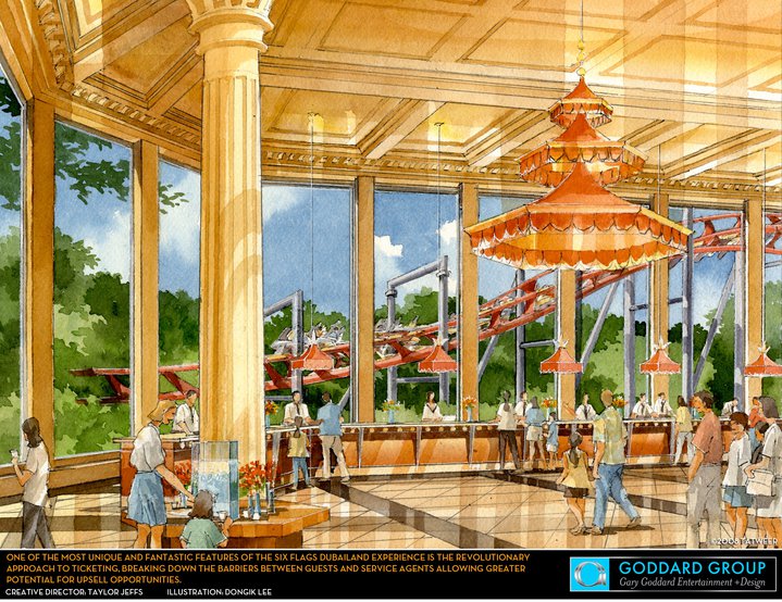 Geez. This looks incredible as well. This reminds me of those Shanghai Disney renderings! Yet, this is Six Flags! Wow, I wish that… I hope that…. you know how my wishes and complaints go. I hope Six Flags decides to copy some of these ideas onto their existing parks. This is what Six Flags Dubailand’s entrance will look like. A step up from Magic Mountain’s entrance, huh?
