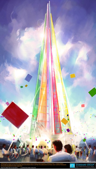 The park will have a six-tower spinning sculpture dedicated to the six flags that stood over Dubai – oh wait, I think they stopped doing that. Were there even six flags over that area?